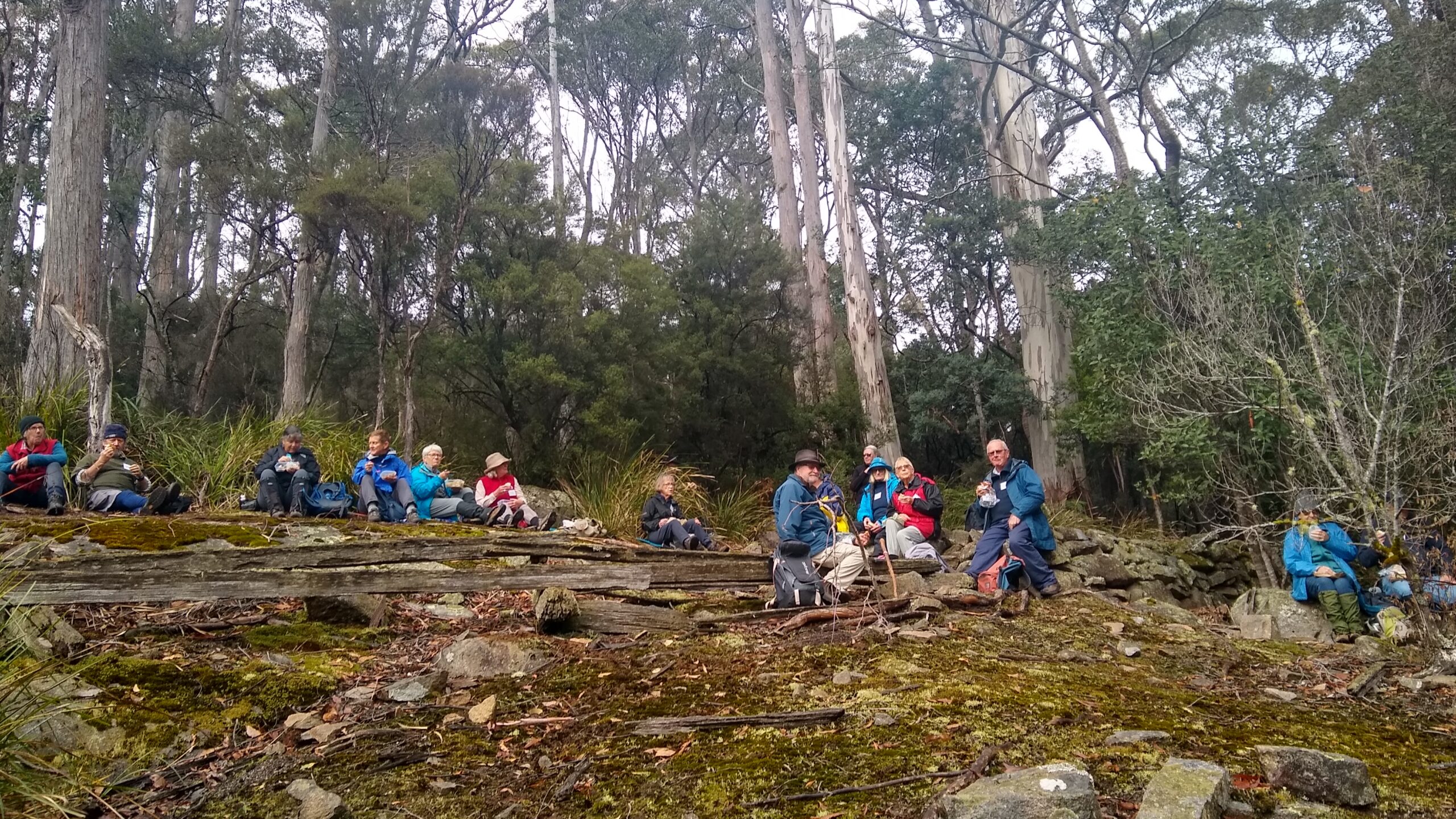 We passed through dry sclerophyll regrowth on both sides, stopping for lunch on a sunny bare granite hillside where the skeletal remains of a collapsed flume lay on the ground.
