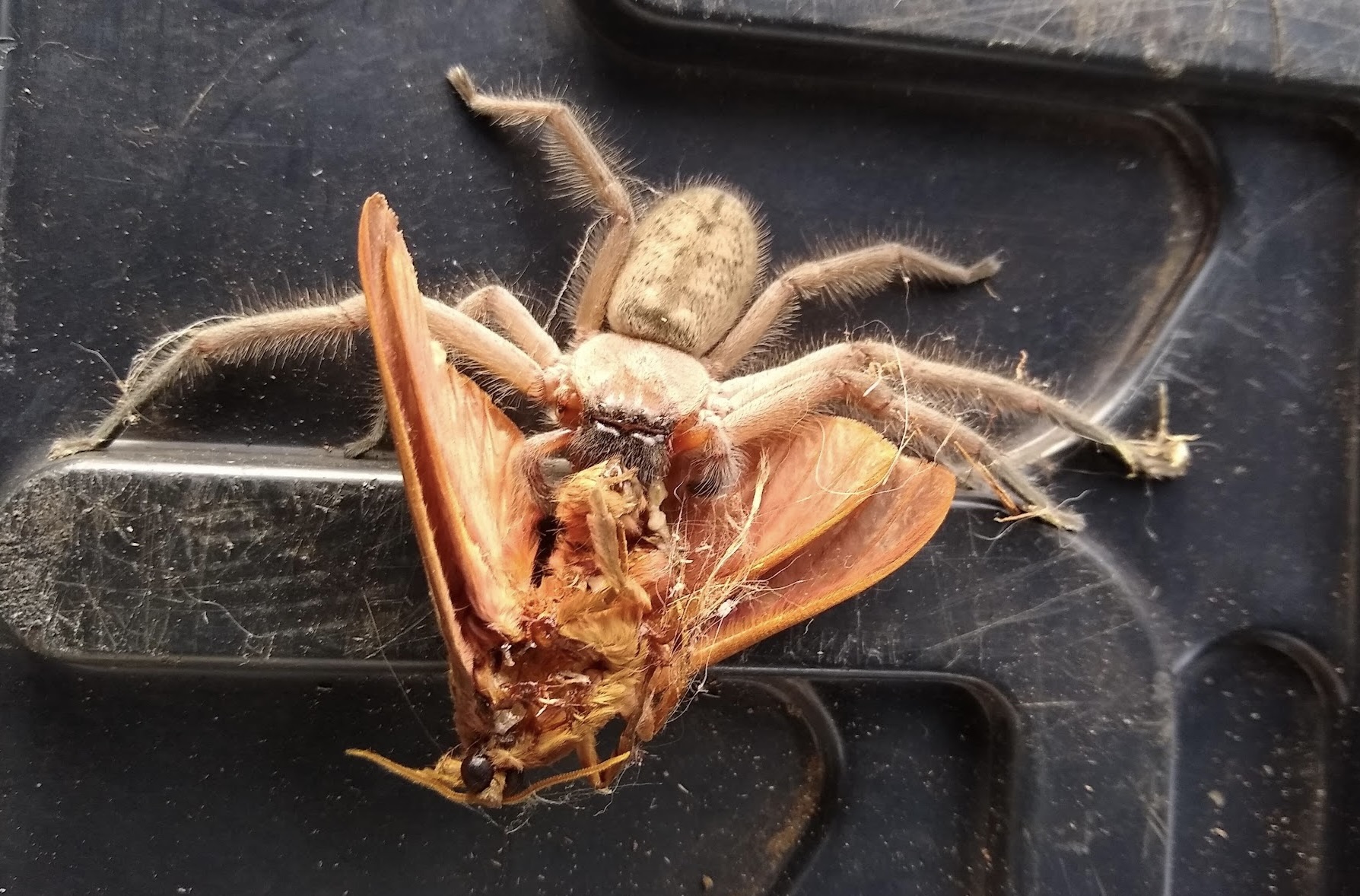 Huntsman spider (Delena cancerides) devouring large moth (LR)