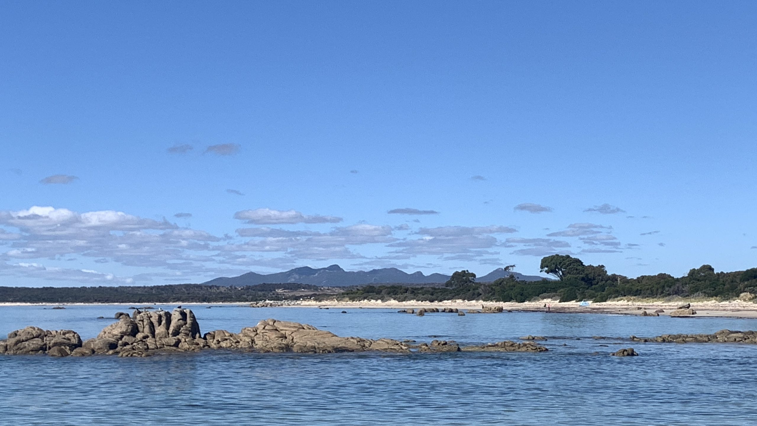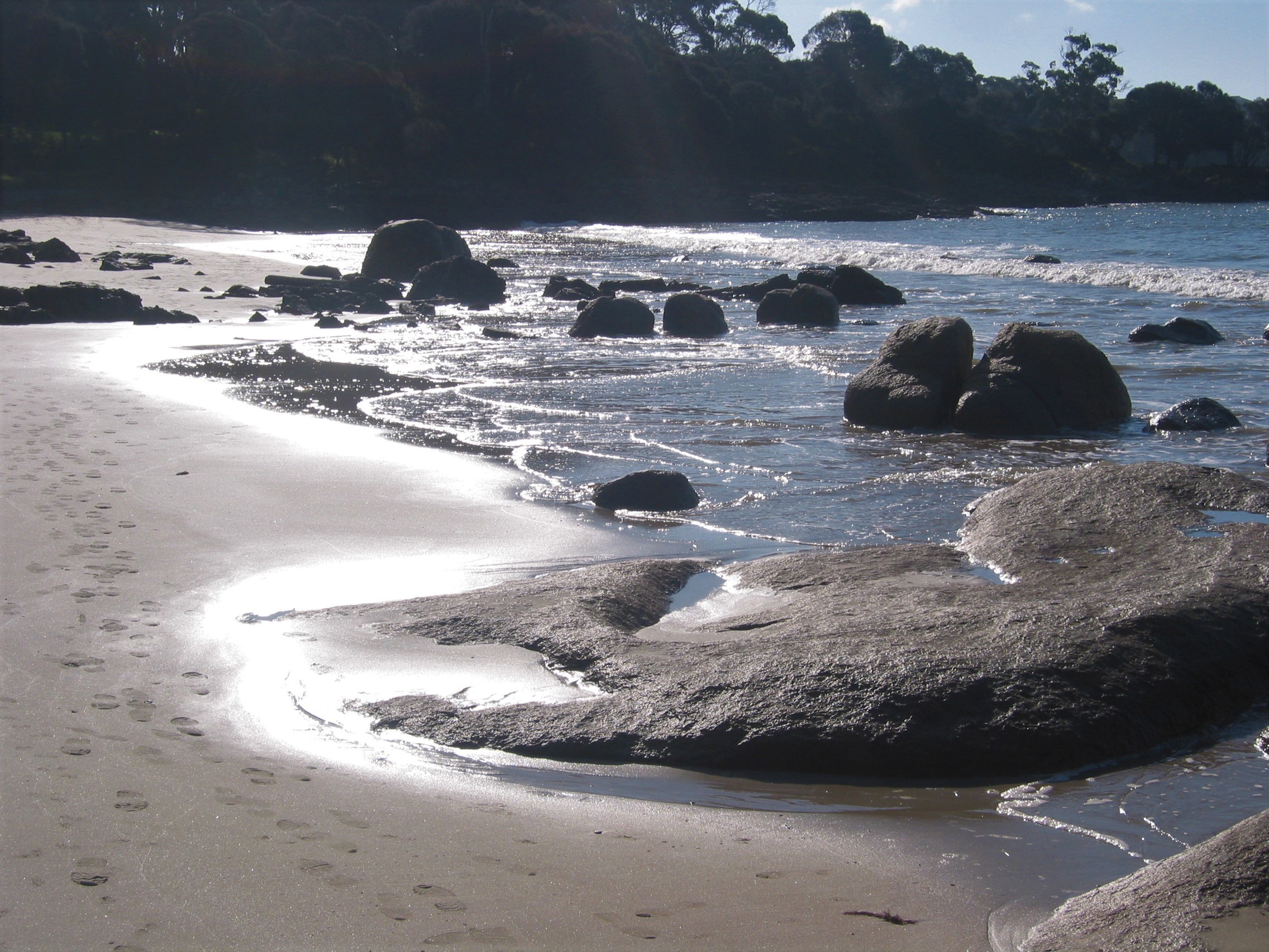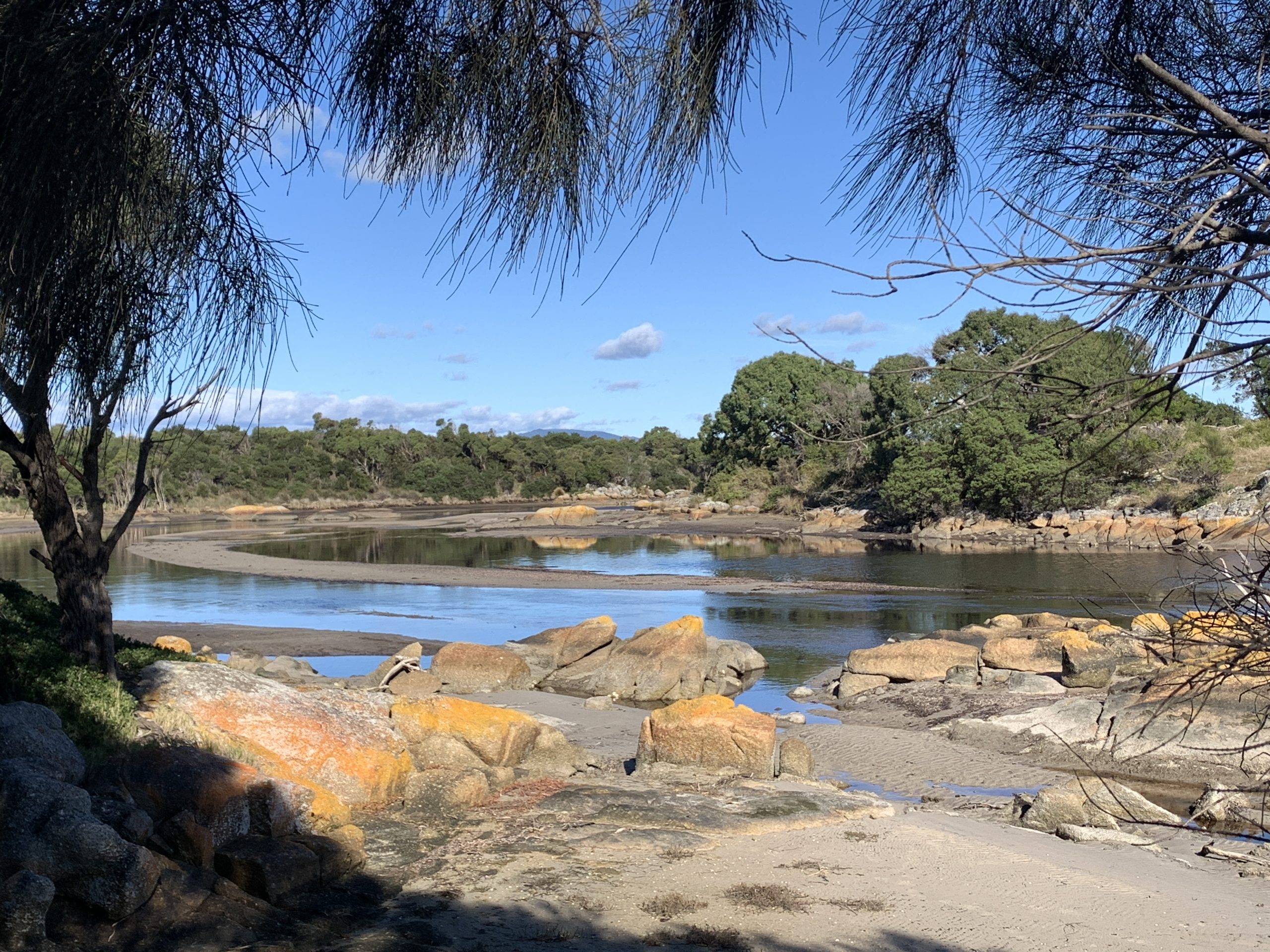 At the western end of the bay, Tomahawk island, near the river mouth, can be walked or waded to at low tide. There is also a pleasant short walk from this end of the beach through sandy vegetation (lots of xanthorreah) to a lovely bend of the Tomahawk River, where the distinctive orange lichen coats the large granite boulders.