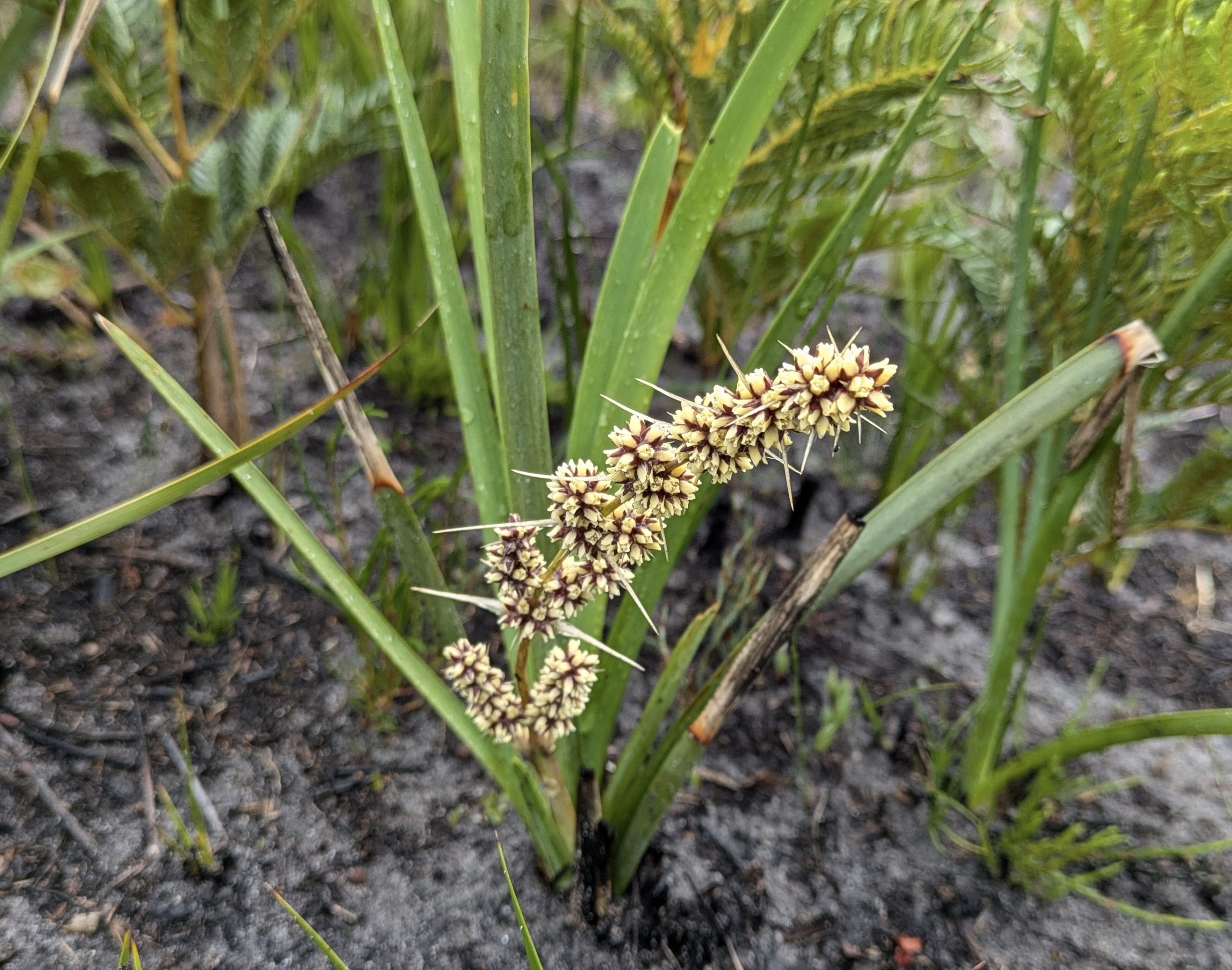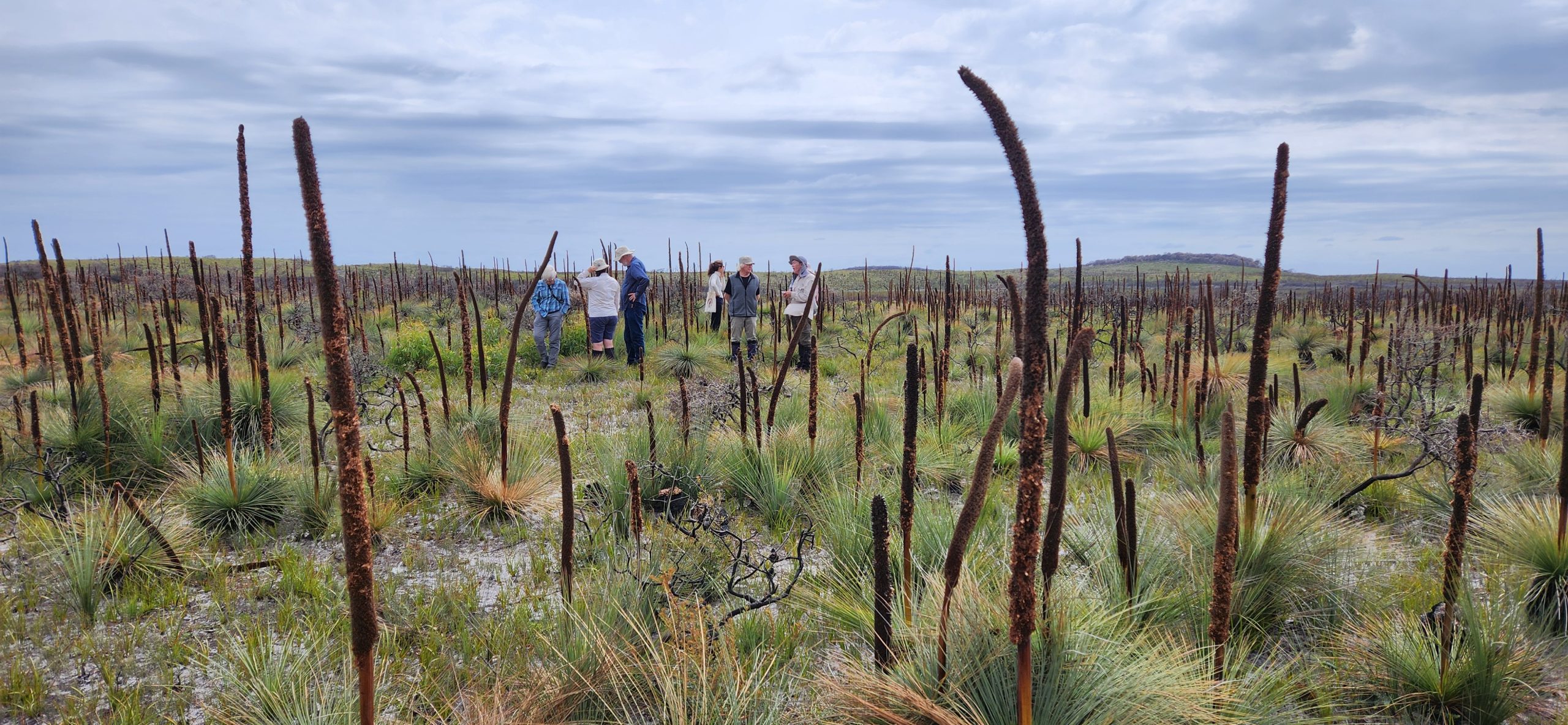 At our first stop, the situation looked dismal; bare sandy soil, blackened branches and trunks. But, as we stood there, swapping fire recovery stories provided by Ross, Jay and Ian, we looked around us on the ground and saw a myriad of tiny plants. Banksias are the most prevalent, but there are also lomandras, lobelias, milkmaids, pigface, paper daisies, cudweed and guinea flowers all starting to flourish. One unusual and very striking purple plant was Lobelia gibbosa the tall lobelia, a first timer for many. Fiona provided a photo of Persoonia juniperina, the prickly geebung from this site. So, all in all, quite a selection of young plants beginning a new life.